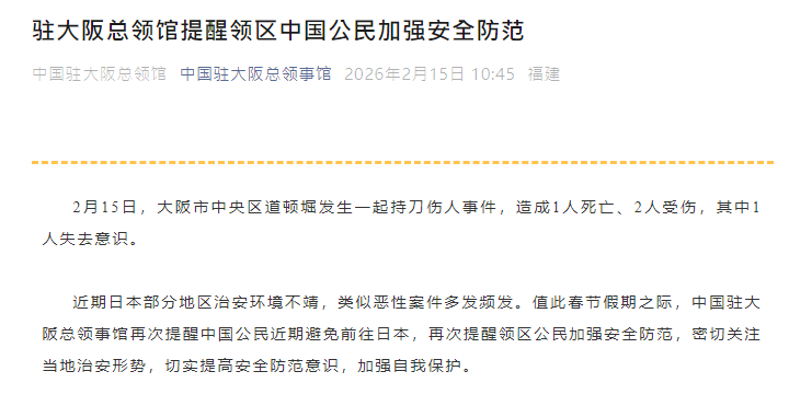 截圖自中國駐大阪總領事館微信公眾號 據央視新聞消息,當地時間15日零時左右,有民眾報警稱,在大阪市道頓堀有多人被刺傷。警方趕赴現場後發現共有3名男性受傷,行兇者疑似與傷者相識。 日本警方表示,大阪市中央區道頓堀當天淩晨發生持刀傷人事件,其中1名受害者死亡,警方已控制一名20多歲男性嫌疑人。 近期日本部分地區治安環境不靖,類似惡性案件多發頻發。值此春節假期之際,中國駐大阪總領事館再次提醒中國公民近期避免前往日本,再次提醒領區公民加強安全防範,密切關注當地治安形勢,切實提高安全防範意識,加強自我保護。 日本緊急求助電話:110(警察)、119(急救、消防)、118(海上事故、海難) 外交部全球領事保護與服務應急熱線(24小時): +86-10-12308 或+86-10-65612308 中國駐大阪總領事館領事保護與協助電話: 06-6445-9427 【編輯:劉春】