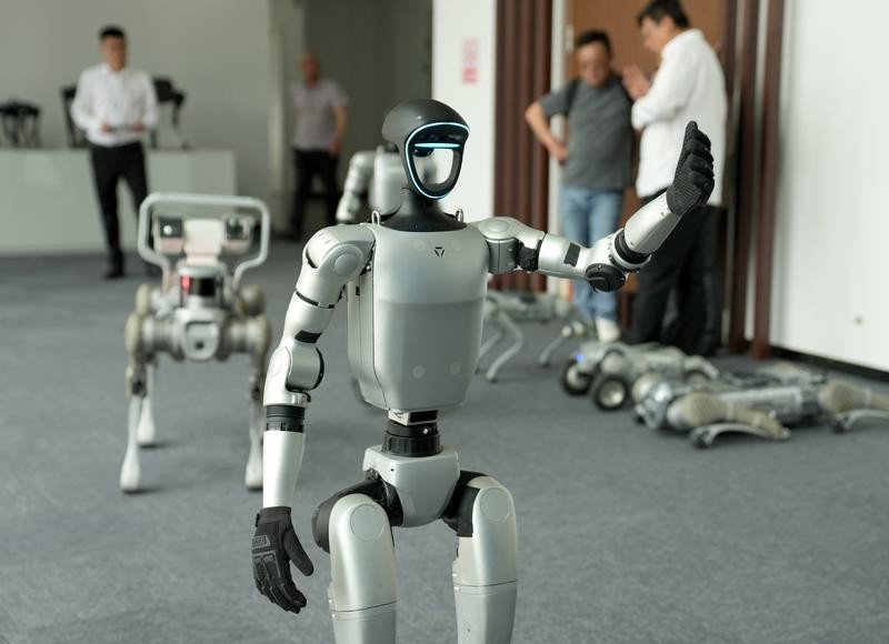 資料圖:在知名機器人公司杭州宇樹科技展廳內,宇樹人形機器人G1展示左手飛吻動作。圖片來源:新華社