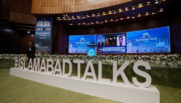這是4月11日在巴基斯坦首都伊斯蘭堡拍攝的美伊談判新聞中心。圖片來源:新華社