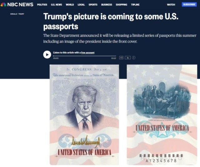 (NBC 報道截圖) 據悉,新版護照將在內頁加入特朗普肖像及《獨立宣言》圖案,並配有其簽名,同時保留現有安全防偽設計。美國國務院表示,該護照為“特別設計版本”,將限量發行。 按照美國國務院發言人皮戈特的說法,這批特製護照是為“慶祝美國建國250周年”。媒體稱,目前尚不清楚新護照將簽發多少本。 據法新社報道,在世界範圍內鮮有國家在護照上展示現任領導人肖像。 自特朗普開始第二個總統任期以來,他的名字或肖像出現在一個又一個“國家符號”上。3月19日,成員由特朗普親自挑選的美國美術委員會批准在美國建國250周年紀念金幣上鑄上特朗普肖像,還稱要讓金幣“盡可能大”。3月26日,美國財政部宣布,將把特朗普的簽名印在美元紙幣上,以紀念美國建國250周年。這將是美元紙幣上首次出現現任總統簽名。3月30日,美國佛羅里達州州長簽署法案,宣布將該州棕櫚灘國際機場更名為“唐納德·特朗普國際機場”。(完) 【編輯:李彥洲】