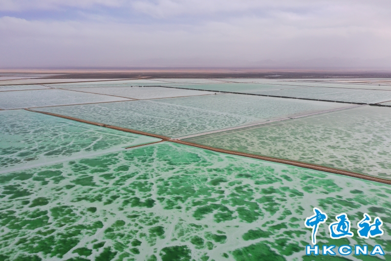 •   3月29日,航拍位於柴達木盆地的青海省海西蒙古族藏族自治州茫崖市翡翠湖。該翡翠湖面積約26平方公里,屬於硫酸鎂亞型鹽湖。 香港中通社圖片