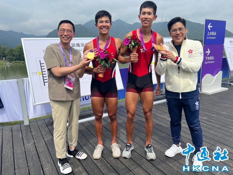 •   9月24日,文化體育及旅遊局局長楊潤雄(左一)恭賀賽艇運動員林新棟(左二)、王瑋駿(右二)在杭州第19屆亞洲運動會(杭州亞運)男子雙人單槳賽勇奪金牌,這是中國香港代表隊於今屆杭州亞運會取得的首面金牌。 香港中通社圖片