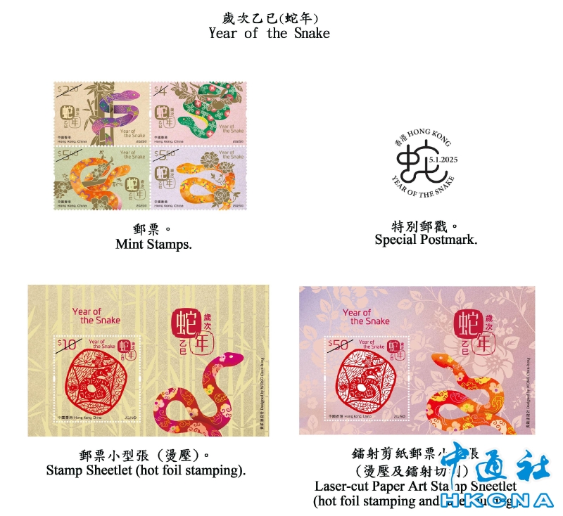 •   巳蛇迎新春,香港郵政17日宣佈,以“歲次乙巳(蛇年)”為題的賀歲生肖郵票及相關郵品將於2025年1月5日推出發售。一套四枚郵票、兩張郵票小型張及相關集郵品均展示不同形態的蛇,配以傳統的賀年元素,展現靈蛇賀歲的歡騰氣氛。 香港中通社圖片