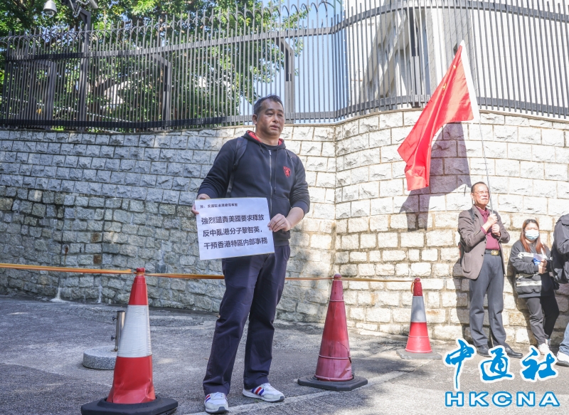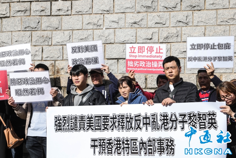 •   2月9日,一眾香港市民在美國駐港澳總領事館前,強烈譴責美國要求釋放反中亂港分子黎智英,干預香港特區内部事務。(香港中通社記者 曹文毓攝) 香港中通社圖片
