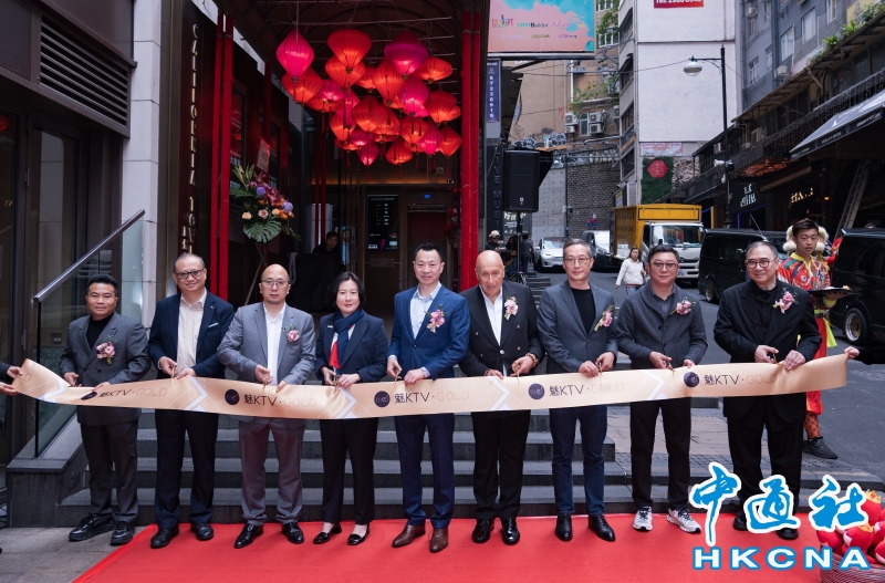 •   2月14日,內地卡拉OK連鎖品牌魅KTV位於中環蘭桂坊的首間香港旗艦店正式開幕。圖為投資推廣署署長劉凱旋(左四)、魅KTV創始人及董事長吳海(中)、蘭桂坊集團主席盛智文博士(右四)與嘉賓主持剪綵儀式。 香港中通社圖片