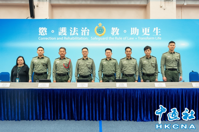 •   2月20日,香港懲教署署長黃國興主持周年記者會,回顧懲教署二○二四年的懲教工作。其他出席記者會的首長級人員為(左起)政務秘書黃展翹博士、助理署長(行動)陳少恒、副署長(行動及策略發展)梁嘉倫、黃國興、副署長(更生及管理)吳超覺、助理署長(更生事務)唐恂、助理署長(服務質素)吳樹勳及助理署長(人力資源)何國文。 香港中通社圖片