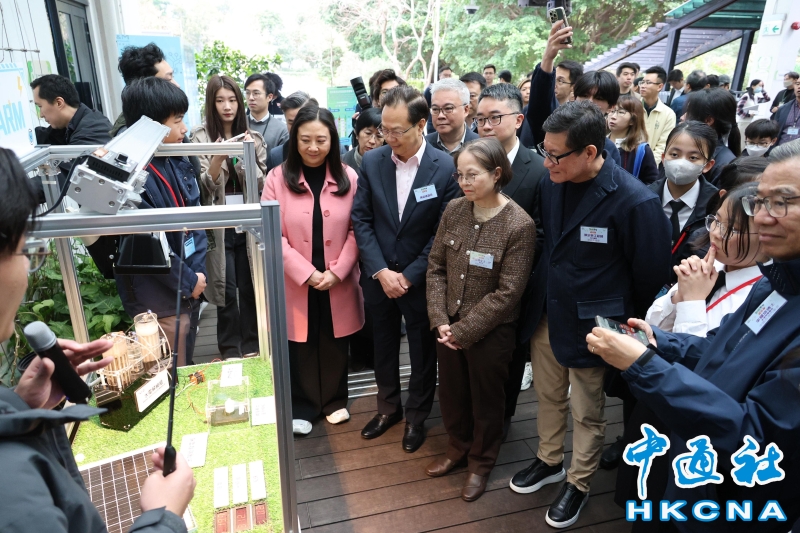 •   由香港機電工程署(機電署)主辦、教育局和建造業零碳天地協辦的“氫能零碳STEAM嘉年華”2月22日及23日舉行。圖為開幕當天嘉賓在展覽攤位觀看利用太陽能光電板生產氫氣的示範。 香港中通社圖片