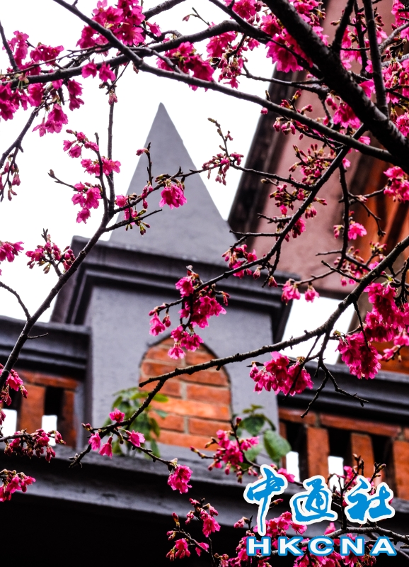 台灣新北市淡水馬偕教堂旁櫻花盛開分享到: