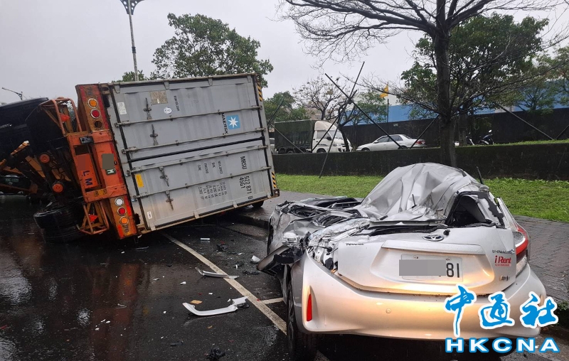 台灣一貨櫃車翻覆 壓扁5車幸無傷亡