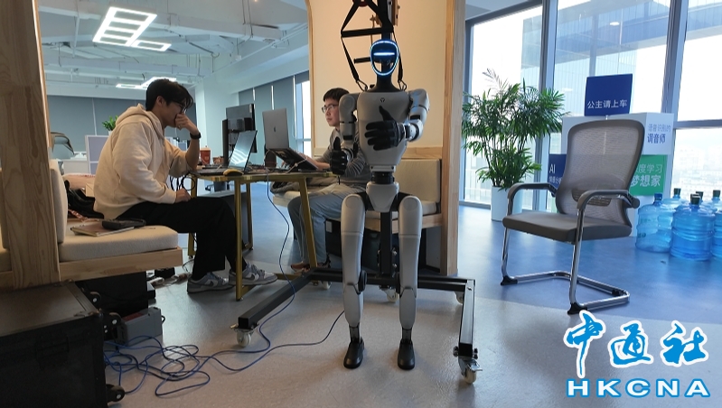 北京深藍學院公司辦公區內,宇樹科技G1型機器人“阿藍”正按照開發人員指令做出相應的手部動作。 香港中通社圖片