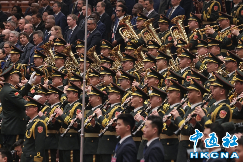 •   3月11日,十四屆全國人大三次會議在北京人民大會堂舉行閉幕會。圖為軍樂團在演奏。(香港中通社記者  謝光磊 攝) 香港中通社圖片