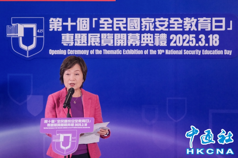 •   3月18日,第十個“全民國家安全教育日”專題展覽開幕典禮在香港歷史博物館舉行。為配合第十個“全民國家安全教育日”,並在律政司、教育局、保安局、公務員事務局和民政及青年事務局全力支持下,國家安全展覽廳推出專題展覽。專題展覽以全國性主題“全民國家安全教育  走深走實十周年”為引領,回顧國家和香港特區多年來在推動全民國家安全教育的發展,專題展覽將於3月19日起開放予公眾參觀。圖為香港特區政府教育局局長蔡若蓮致辭。(香港中通社記者 許其皓攝) 香港中通社圖片