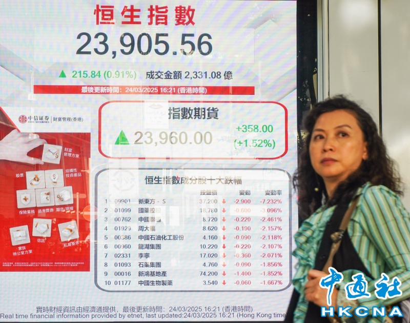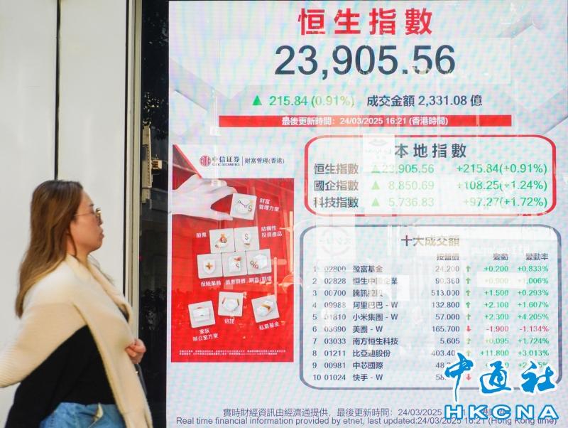 •   3月24日,截至收盤,香港恒生指數漲215.84點,漲幅0.91%,報23905.56點,主板全天成交2331.08億港元。(香港中通社記者 曹文毓攝) 香港中通社圖片