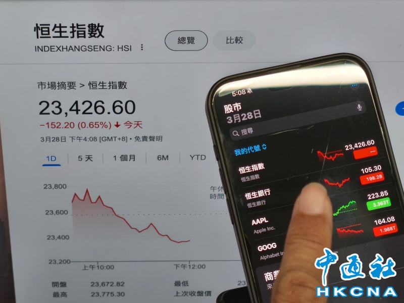 •   3月28日,香港恒生指數收市報23426點,跌152點,跌幅0.65%,主板成交額逾2296億元。 香港中通社圖片