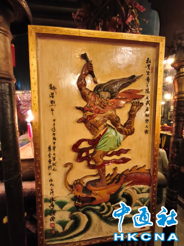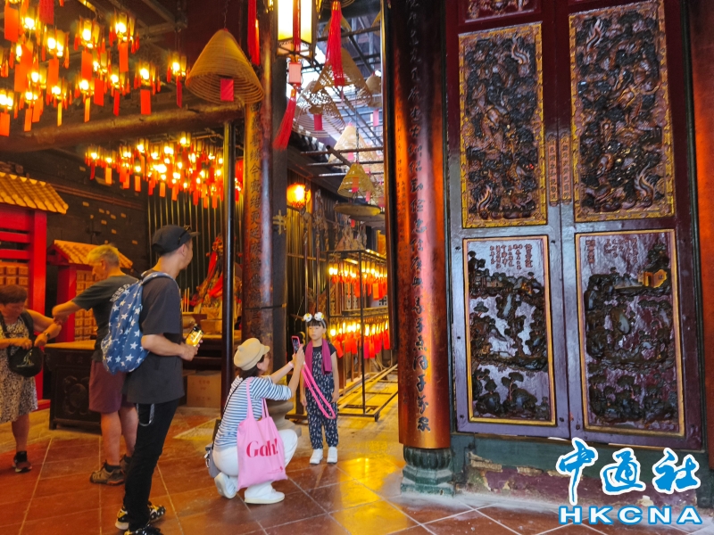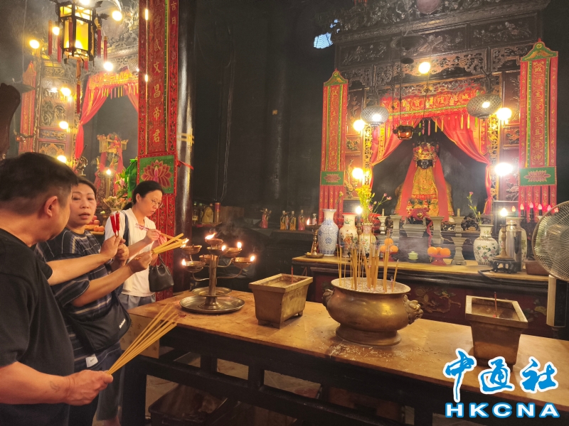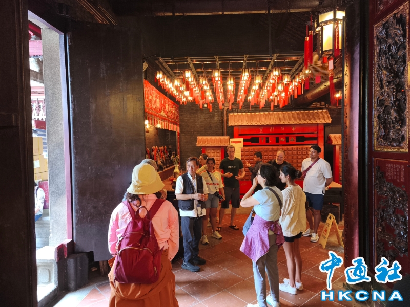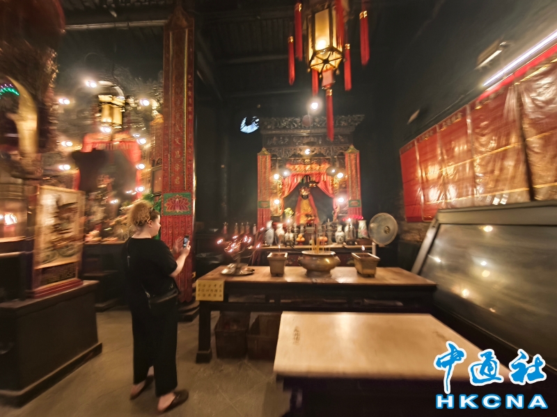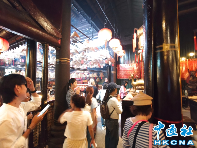 近日,香港發展旅遊熱點工作組公佈首階段旅遊熱點落實項目,公佈九個旅遊熱點項目,包括能回溯香港工業品牌變遷、中環citywalk(漫步)、生態遊,再闖入九龍城遊歷城寨風光,並擬開放旅客熱熾期望的“打卡”熱點。在中環漫步舊城,屋頂由綠瓦鋪成的文武廟是眾多訪港遊客參觀遊覽的地方,文武廟估計建於1847至1862年間,由文武廟、列聖宮和公所三幢建築組成。文武廟主要供奉文昌及武帝(關帝);列聖宮用作供奉諸神列聖;而公所則是當時華人議事及解決紛爭的地方。文武廟內還完好地保留了鑄於1847年的銅鐘,和造於1862年的官轎。古廟屋頂的花崗石柱、花崗石門框、木雕匾額和歷史悠久的壁畫,更是巧奪天工,盡顯精湛的傳統工藝和技術,活靈活現地展示中式建築的特色。善信來文武廟,有的祈求學業猛進、有的祈求事事順景。你可以準備元寶衣紙、一紮細香、三枝長壽香及香油錢,奉上香火誠心祈福。其他供品例如生菜寓意“生財”;圓形的橘子類水果則代表圓滿和順利。文武廟除了華人信仰拜祭外,近年吸引不少外國遊客來此感受傳統文化。(香港中通社記者洪少葵攝) 香港中通社圖片