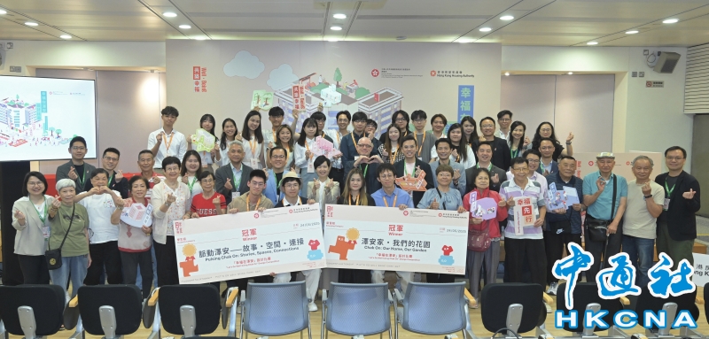 •   香港房屋局和香港房屋委員會(房委會)5月24日在房委會總部舉行“幸福在澤安”設計比賽頒獎典禮,並公佈得獎結果。圖為房屋局局長何永賢(前排左九)與其他嘉賓及得獎者合照。 香港中通社圖片