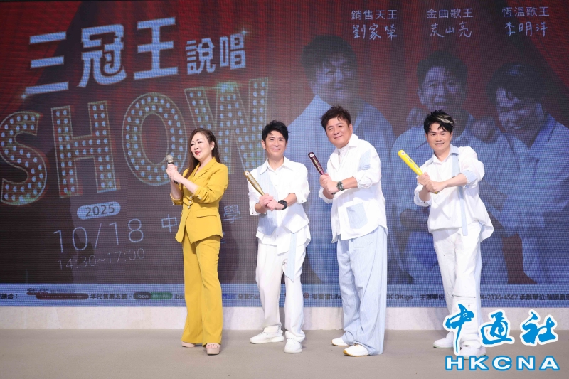 •   6月12日,(左起) 張秀卿站台力挺荒山亮、劉家榮、李明洋10月舉辦的“三冠王說唱會”,祝賀三人首次合體開唱,強棒出擊,票房秒殺。 香港中通社圖片