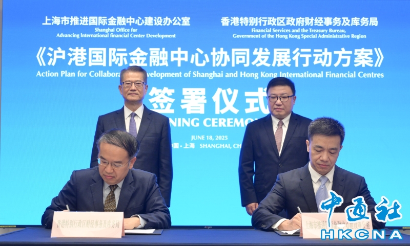 •   香港特區財政司司長陳茂波和財經事務及庫務局局長許正宇6月18日出席《滬港國際金融中心協同發展行動方案》發布儀式。圖為在陳茂波(後排左)和上海市委常委及常務副市長吳偉(後排右)見證下,財經事務及庫務局局長許正宇(前排左)和上海市推進國際金融中心建設辦公室主任、上海市地方金融管理局局長周小全(前排右)簽署《滬港國際金融中心協同發展行動方案》。 香港中通社圖片