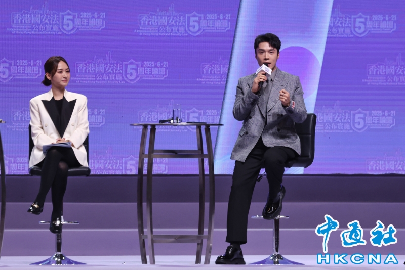 •   6月21日,香港國安法公布實施五周年論壇在香港會議展覽中心大會堂舉行,論壇下午舉行座談環節。圖為香港男演員丁子朗(右)出席第二節座談會並發言。(香港中通社記者 謝光磊 攝) 香港中通社圖片