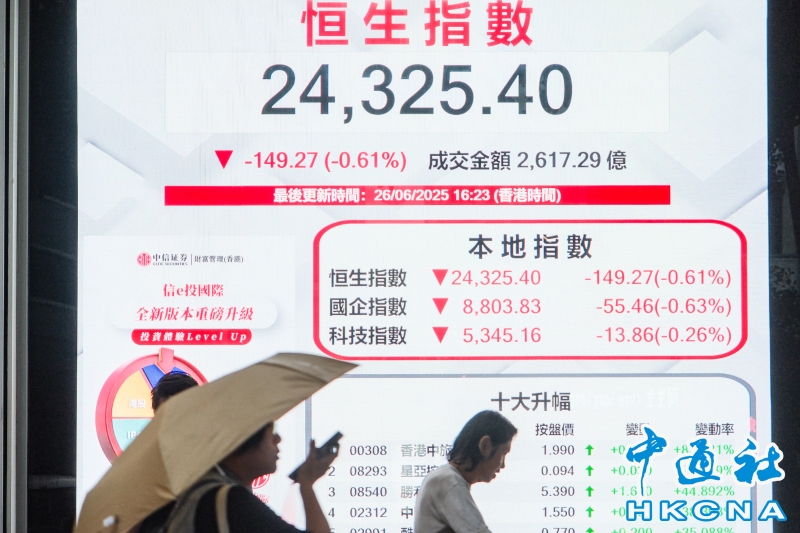 •   6月26日,截至收盤,香港恒生指數跌149.27點,跌幅0.61%,報24325.40點,主板全天成交2617.29億港元。(香港中通社記者 許其皓攝) 香港中通社圖片