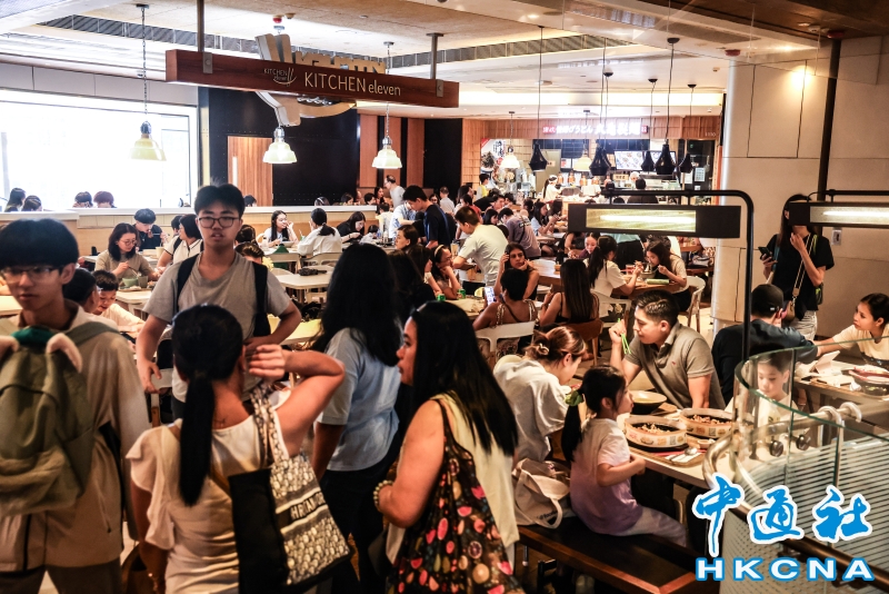 •   逾4000間食肆商戶提供優惠慶祝香港回歸祖國28周年,稻苗飲食專業學會榮譽會長邱金榮在電台節目表示,尖沙咀、旺角或大型商場等生意有約兩成增長。圖為銅鑼灣一間大型商場食肆滿座。 香港中通社圖片