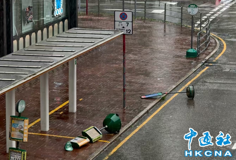 7月20日,香港十號颶風信號下,民政事務總署在各區共開放34個臨時庇護中心,共有221人入住。截至當天上午10時,當局共收到85宗塌樹報告。 圖為巴士站被強風吹襲。(香港中通社記者梁嘉軒攝)