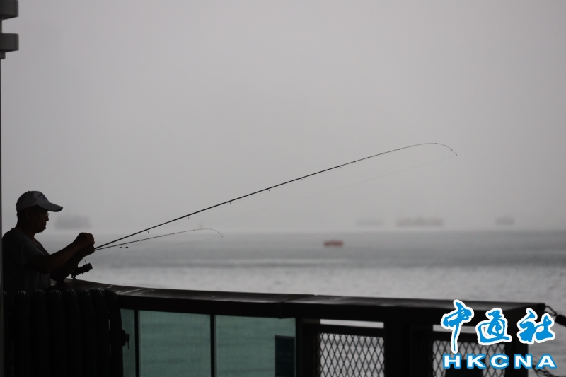 7月29日,香港天文台上午9時10分發出黑色暴雨警告信號,香港廣泛地區雨勢持續。天文台指,受廣闊低壓槽的強雷雨區影響,東區及南區的雨勢特別大,已錄得每小時超過100毫米的大暴雨。教育局宣佈,所有下午校今日下午停課。 圖為市民在黑色暴雨警告信號下海濱垂釣。(香港中通社記者洪少葵攝) 香港中通社圖片