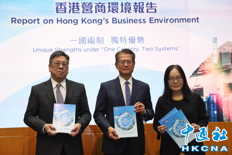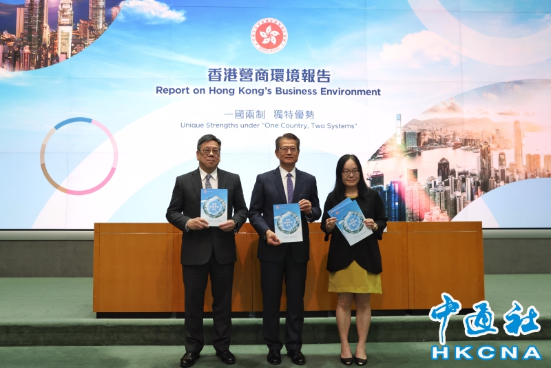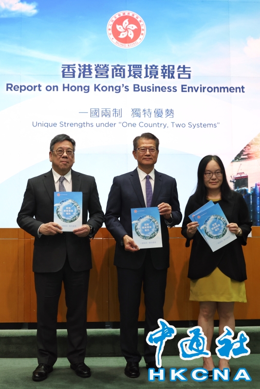 7月30日,香港特別行政區政府發布《香港營商環境報告:一國兩制 獨特優勢》。報告向社會各界和海內外投資者詳細介紹香港的最新發展和優勢,全方位說明香港開放、安全、穩定、高效和國際化的營商環境。圖為香港特區政府財政司司長陳茂波(中)主持記者會。(香港中通社記者 謝光磊 攝) 香港中通社圖片