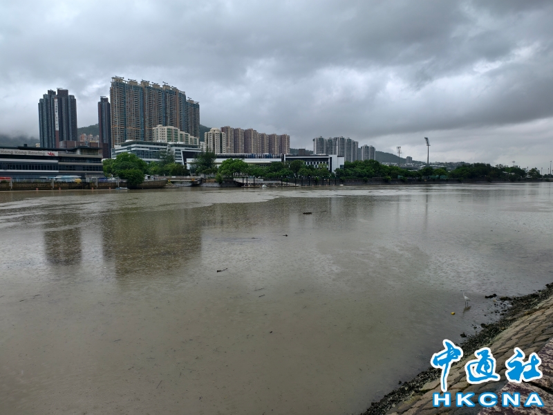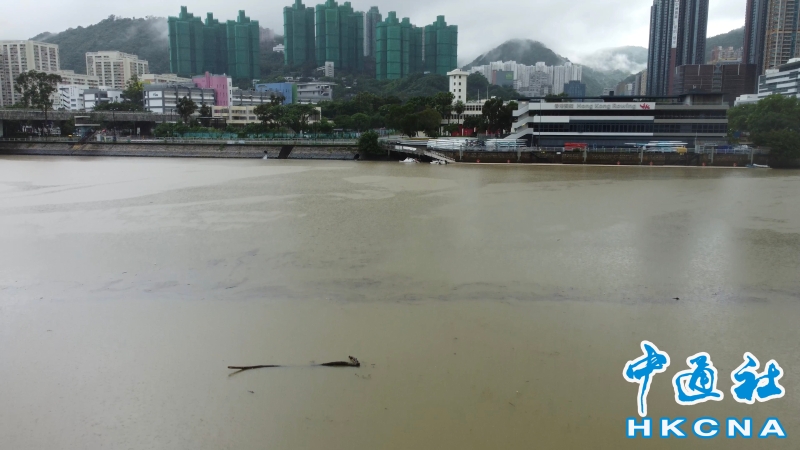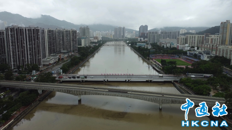 香港天文台5日早上發出黑色暴雨警告信號,至少持續至下午5時。民政事務總署公佈,沙田下城門水塘水位已達到警戒線,警方圍封河道兩岸以免發生危險。圖為城門河在暴雨後河水渾濁、水位正常。(香港中通社記者 梁嘉軒攝) 香港中通社圖片