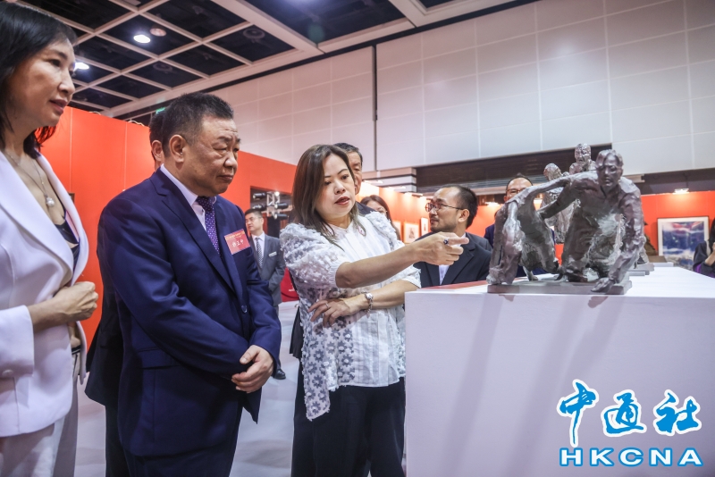 8月6日,“銘記歷史 珍愛和平——紀念中國人民抗日戰爭暨世界反法西斯戰爭勝利80周年名家名作展”在香港會展中心開幕。本次展覽,設置了銘記歷史、緬懷先烈、春回大地、江山永固、開天闢地、珍愛和平六個主題單元,展出了兩百多件藝術珍品,包括著名雕塑家吳為山創作的侵華日軍南京大屠殺遇難同胞紀念館組雕、著名畫家張仃創作的抗戰組畫、著名版畫家梁永泰創作的《戰鬥中的鐵騎》等。此外,還展出了齊白石、傅抱石、蔣兆和、李可染、李苦禪、葉淺予、何香凝、啓功、趙少昂等大師的精品力作。圖為文化體育及旅遊局局長羅淑佩、紫荊文化集團董事長許正中等人參觀展覽。(香港中通社記者 曹文毓攝) 香港中通社圖片