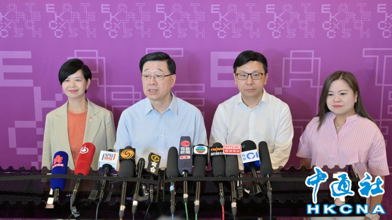 •   8月23日,香港特區行政長官李家超(左二)到訪觀塘區就新一份《施政報告》聽取市民意見後,在房屋局局長何永賢(左一)、勞工及福利局局長孫玉菡(右二)和文化體育及旅遊局局長羅淑佩(右一)陪同下會見傳媒。 香港中通社圖片