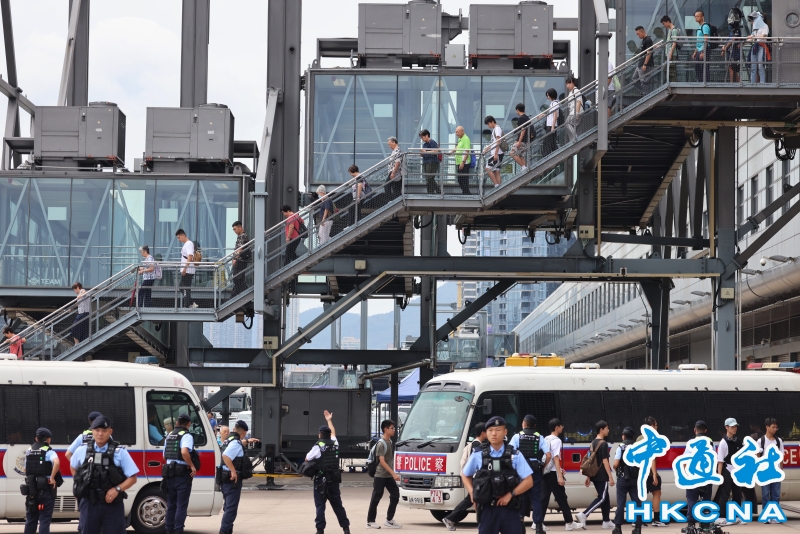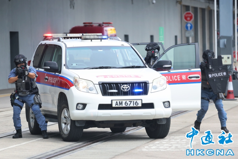 8月28日,香港跨部門反恐專責組在啟德郵輪碼頭進行代號“勇光”的跨部門反恐演習。圖為演習模擬機動部隊設立封鎖線,確保分流區域安全。(香港中通社記者 謝光磊 攝) 香港中通社圖片