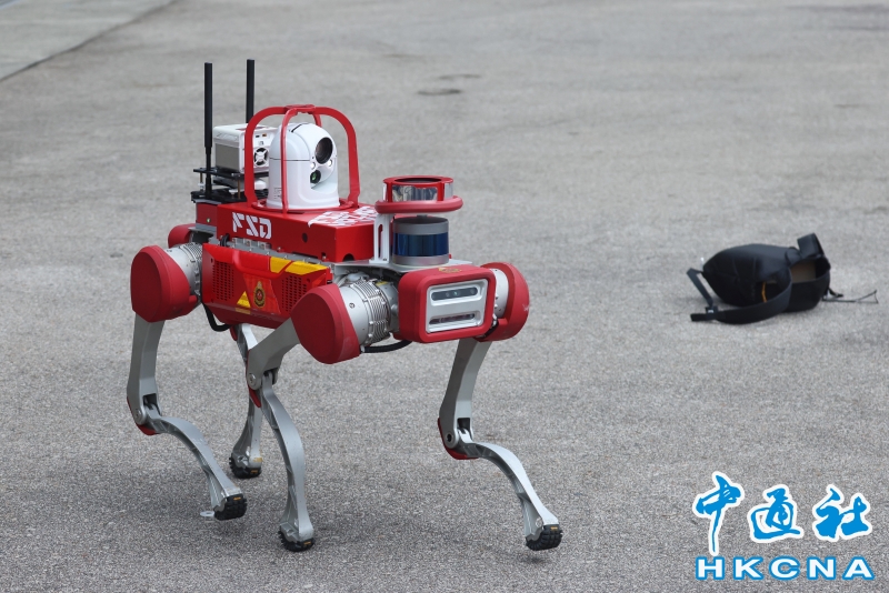 8月28日,香港跨部門反恐專責組在啟德郵輪碼頭進行代號“勇光”的跨部門反恐演習。圖為演習模擬警方在現場地下發現一個電線外露的黑色背囊,懷疑裏面藏有爆炸品。消防處增派機械狗及滅火機械人到場支援。機械狗配備熱成像鏡頭,可以實時監測可疑背囊。(香港中通社記者 謝光磊 攝) 香港中通社圖片