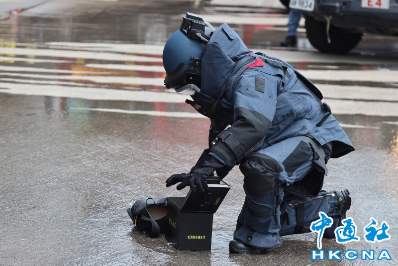 8月28日,香港跨部門反恐專責組在啟德郵輪碼頭進行代號“勇光”的跨部門反恐演習。圖為演習模擬警方在現場地下發現一個電線外露的黑色背囊,懷疑裏面藏有爆炸品。爆炸品處理課出動拆彈機械人進行初步摧毀。(香港中通社記者 謝光磊 攝) 香港中通社圖片