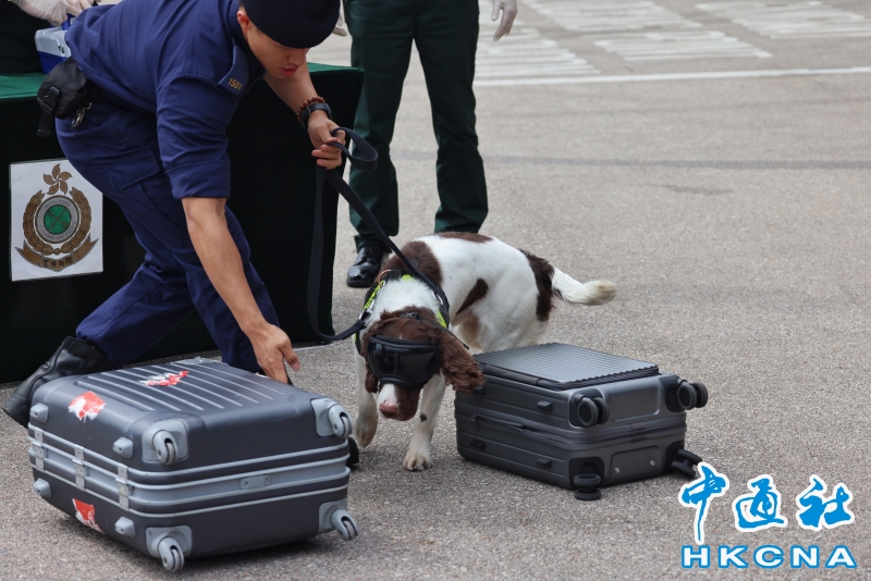 8月28日,香港跨部門反恐專責組在啟德郵輪碼頭進行代號“勇光”的跨部門反恐演習。圖為演習模擬海關人員在碼頭前沿區為未進行入境手續旅客的寄倉行李進行風險檢查,包括利用海關爆炸品搜查犬進行搜查。(香港中通社記者 謝光磊 攝) 香港中通社圖片