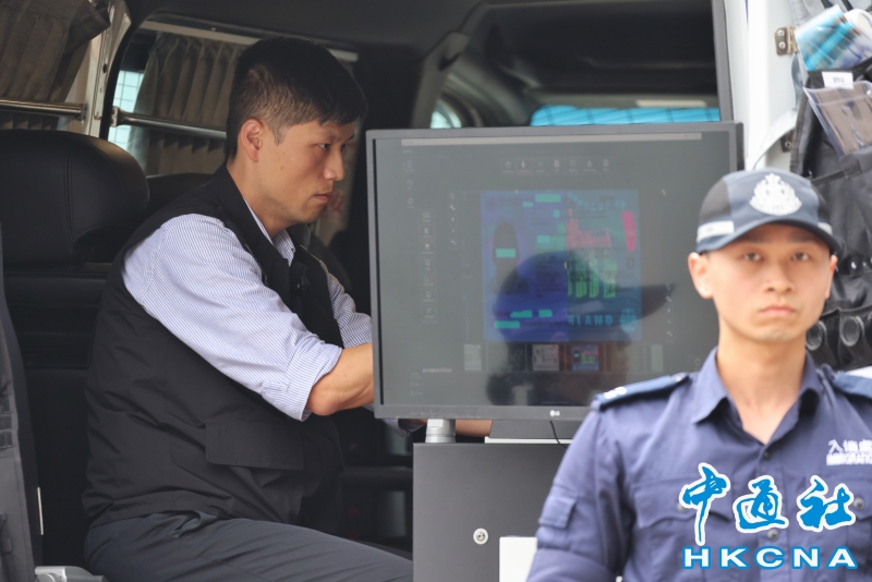 8月28日,香港跨部門反恐專責組在啟德郵輪碼頭進行代號“勇光”的跨部門反恐演習。圖為演習模擬入境處收到警方通知後,出動流動鑑證戰術車到場協助查驗證件真僞。(香港中通社記者 謝光磊 攝) 香港中通社圖片