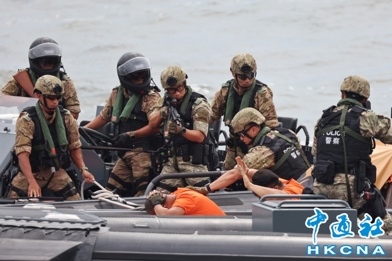 8月28日,香港跨部門反恐專責組在啟德郵輪碼頭進行代號“勇光”的跨部門反恐演習。圖為演習模擬警務處小艇分區出動兩艘高速追截艇追截目標快艇,採用“二對一 ”戰術隊型,有利於水警人員在高速追截期間互相支援,限制疑船移動範圍,再將目標帶入可控水域,以降低碰撞及擱淺風險。(香港中通社記者 謝光磊 攝) 香港中通社圖片