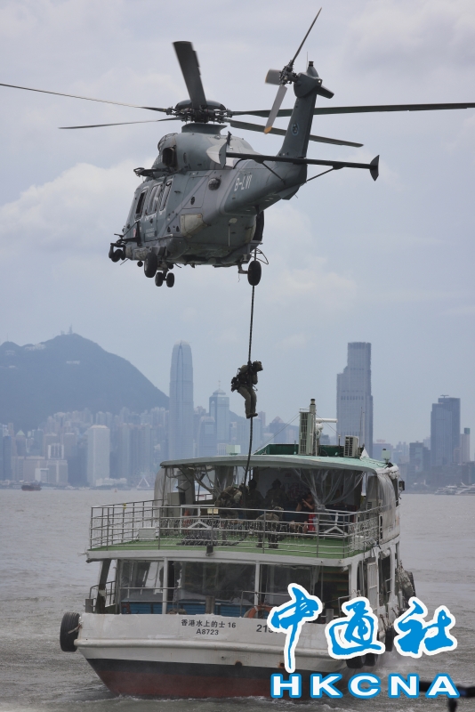 8月28日,香港跨部門反恐專責組在啟德郵輪碼頭進行代號“勇光”的跨部門反恐演習。圖為演習模擬極端分子挾持客船上20多名船員及乘客作為人質。一架飛行服務隊直昇機正向客船方向駛過去,載有多名飛虎隊人員,飛虎隊人員游繩下降至客船,而另一批飛虎隊人員亦由小艇登上客船,與極端份子駁火。(香港中通社記者 謝光磊 攝) 香港中通社圖片