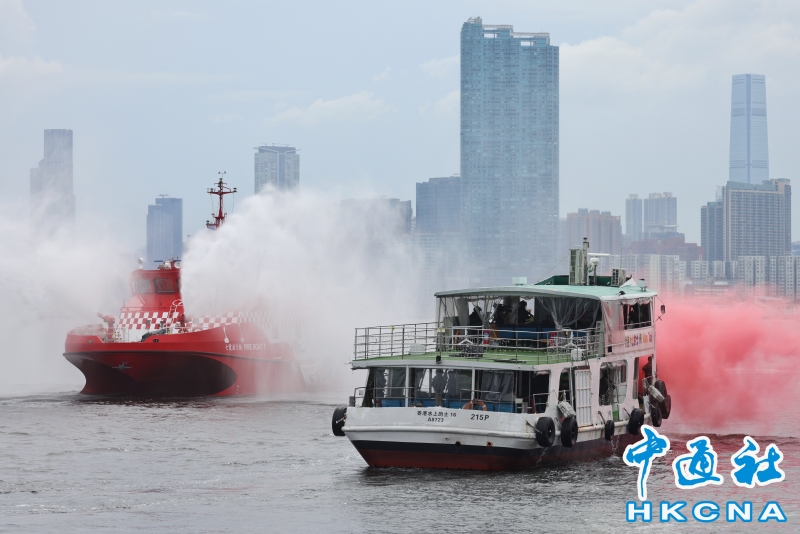 8月28日,香港跨部門反恐專責組在啟德郵輪碼頭進行代號“勇光”的跨部門反恐演習。圖為演習模擬一名極端份子嘗試縱火,船頭位置突然冒出火光及濃煙。消防處滅火輪利用遙控水炮控制火勢。(香港中通社記者 謝光磊 攝) 香港中通社圖片