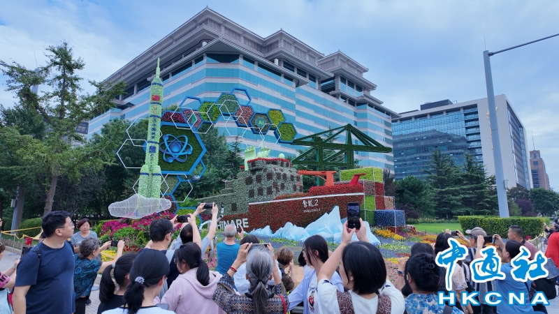 •     北京西長安街西單路口“科技強國”花壇旁,前來打卡參觀的民眾絡繹不絕。 香港中通社圖片