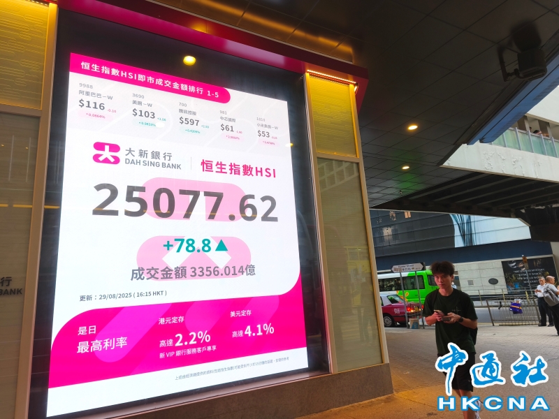 •   9月1日,港股連升兩日,恒指收市創一周新高,報25617點,升539點,升幅2.15%,主板成交額增至逾3802億元。 香港中通社圖片