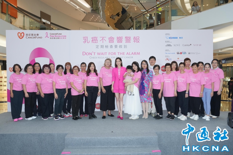 •   9月17日,香港癌症基金會假九龍塘又一城舉行“癌症基金會粉紅革命”啟動禮。圖為啟動禮的主禮嘉賓及乳癌康復者合照,齊心宣揚活動口號:“乳癌不會響警報,定期檢查要做到。” 香港中通社圖片