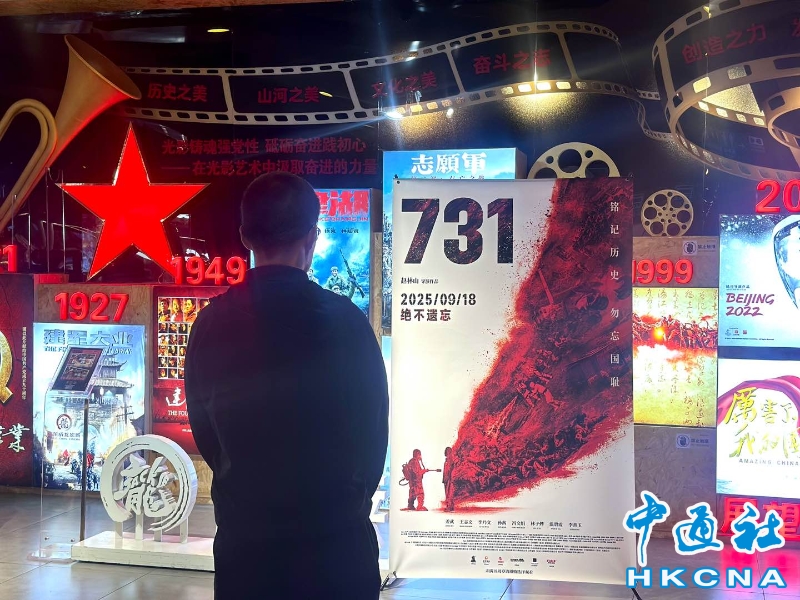 •     2025年9月20日北京某電影院,散場觀眾在電影《731》海報前駐足觀看。 香港中通社圖片