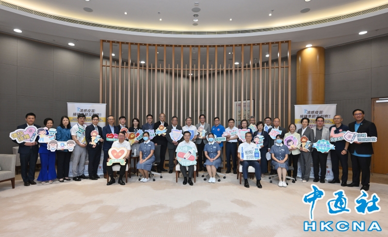 •   香港特區行政長官李家超早前率領多名主要官員接種季節性流感疫苗,並呼籲市民盡早接種,合力築起社區免疫屏障,更好保護自己和家人的健康。圖為香港特區行政長官李家超(前排左三)、政務司司長陳國基(前排左一)、財政司司長陳茂波(前排右二)、政務司副司長卓永興(後排左十二)、財政司副司長黃偉綸(後排中),以及多名主要官員呼籲市民盡早接種季節性流感疫苗,合力築起社區免疫屏障,更好保護自己和家人的健康。 香港中通社圖片