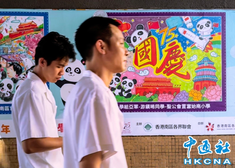 •   國慶節臨近,香港南區街頭迎國慶氛圍濃厚。圖為香港仔一天橋下展示去年小學生創作的慶祝國慶壁畫。香港中通社記者 徐文峰攝) 香港中通社圖片