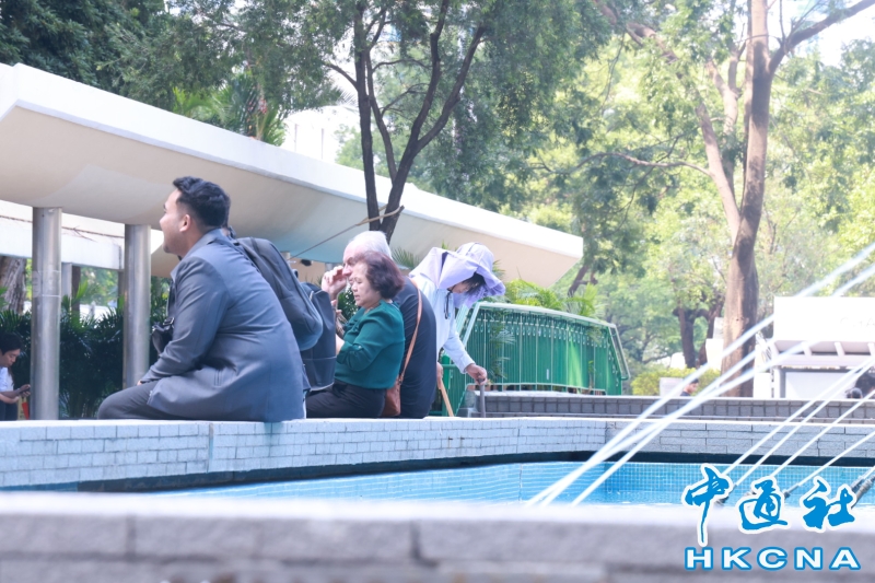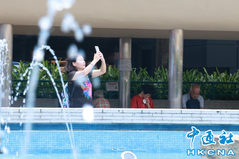 •   10月9日,市民在炎熱天氣下出行。當天香港天文台發出酷熱天氣警告。圖為市民在水池旁乘涼。(香港中通社 鄧梓傑攝) 香港中通社圖片