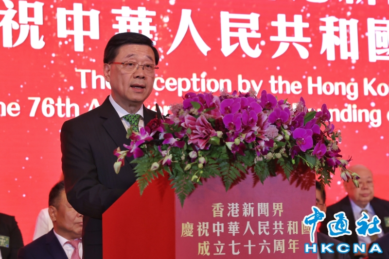 •   10月9日,香港新聞界慶祝中華人民共和國成立76周年活動在香港舉行,近500位社會各界賢達與新聞界同仁齊聚一堂,祝願祖國繁榮昌盛,香港社會穩定發展。圖為香港特區行政長官李家超致辭。(香港中通社記者  謝光磊 攝) 香港中通社圖片