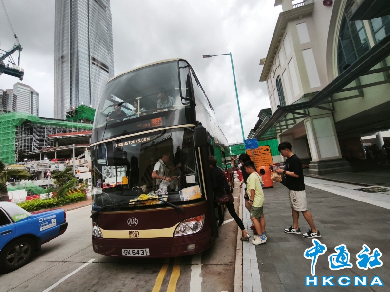 •   10月11日,香港運輸及物流局局長陳美寶表示,很高興從社交媒體看到不少訪港旅客對香港的公共交通非常感興趣,觀光巴士配搭雙層開篷巴士的設計,為旅客帶來全新的城市遊覽體驗。黃金周期間,城巴及九巴營運合共3組旅遊路線,整體乘客量上升超過1.5倍,總乘客人次超過5萬,足以證明新的思維能夠為專營巴士廣開客路。圖為旅客在中環碼頭乘搭觀光巴士。 香港中通社圖片