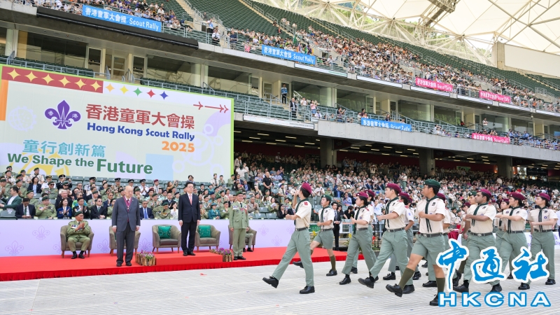 •   10月26日,香港特區行政長官李家超出席在香港大球場舉行的香港童軍大會操2025。圖為特首李家超(左二)檢閱步操隊伍。 香港中通社圖片