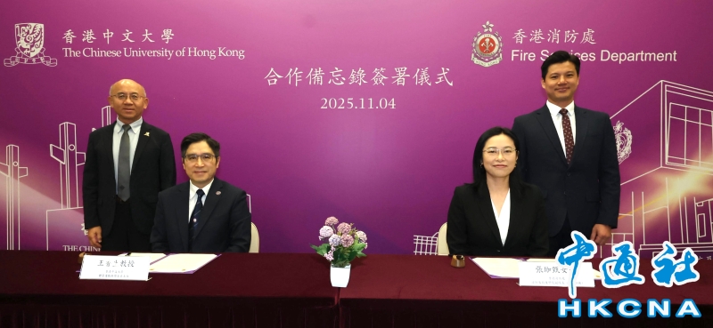 •   11月4日,香港消防及救護學院副院長(救護訓練)張珈甄(右二)和香港中文大學(中大)體育運動科學系主任王香生教授(左二)簽署合作備忘錄,由消防及救護學院與中大的體育運動科學系和賽馬會公共衞生及基層醫療學院合作,共同舉辦有關緊急護理及應急準備的培訓課程。消防及救護學院院長趙汝珏(右一)和中大教育學院院長范息濤教授(左一)亦在場見證簽署儀式。 香港中通社圖片